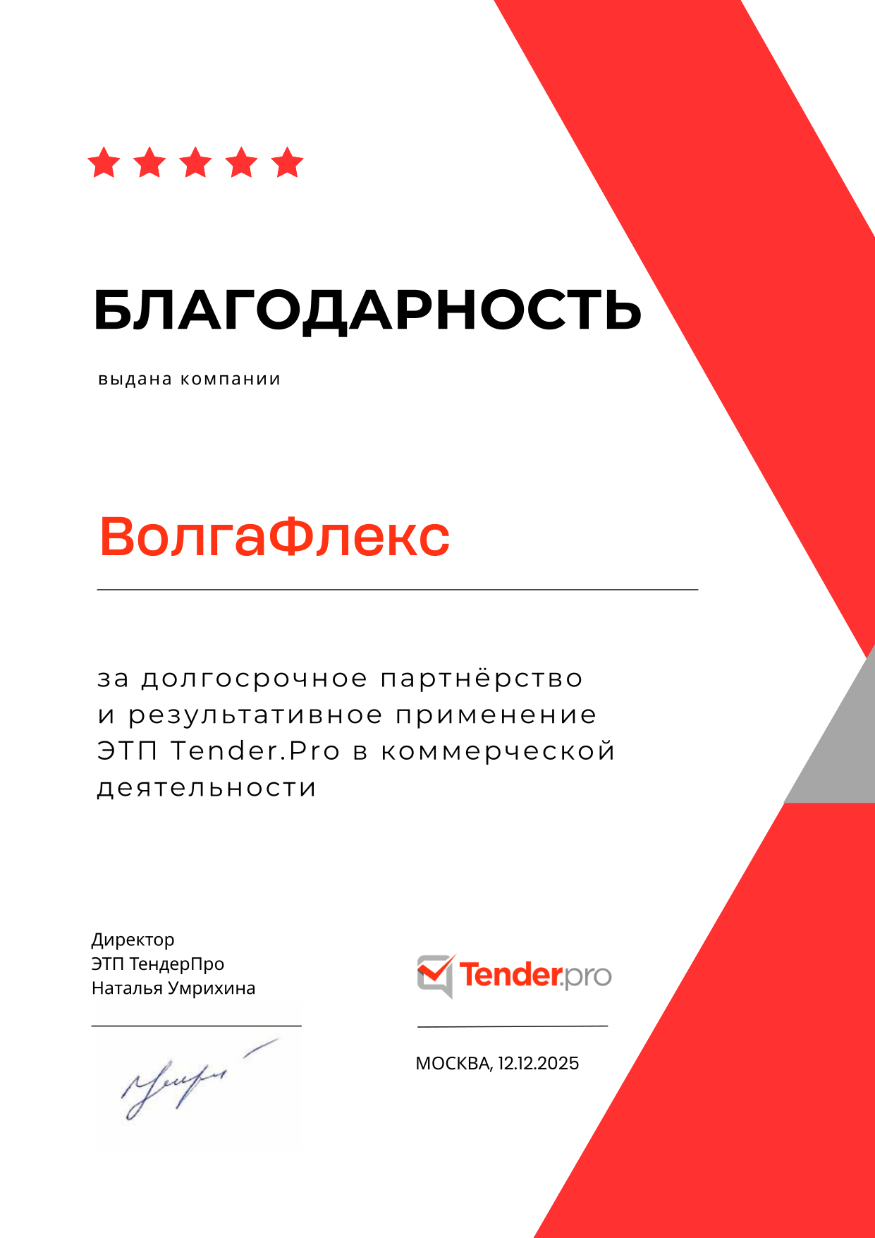 ЭТП Tender.Pro отметила нашу компанию благодарственным письмом за долговременное и эффективное использование возможностей электронной торговой площадки в наших бизнес-процессах. Для нас это важный знак доверия и подтверждение нашей надежности.